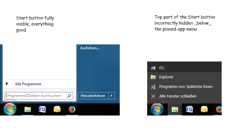 when for the start button you use a custom image, which is a bit higher than the height of the taskbar, then when you open the start menu, the button correctly is displayed on top of it, so that the menu does not cut it off. However, this is not working correctly for the menu of pinned apps: The Start button is not layered above the menu of pinned apps, but instead is incorrectly layered below these menus. Basically the top part of the start button is then hidden below the menu, which looks ugly.
