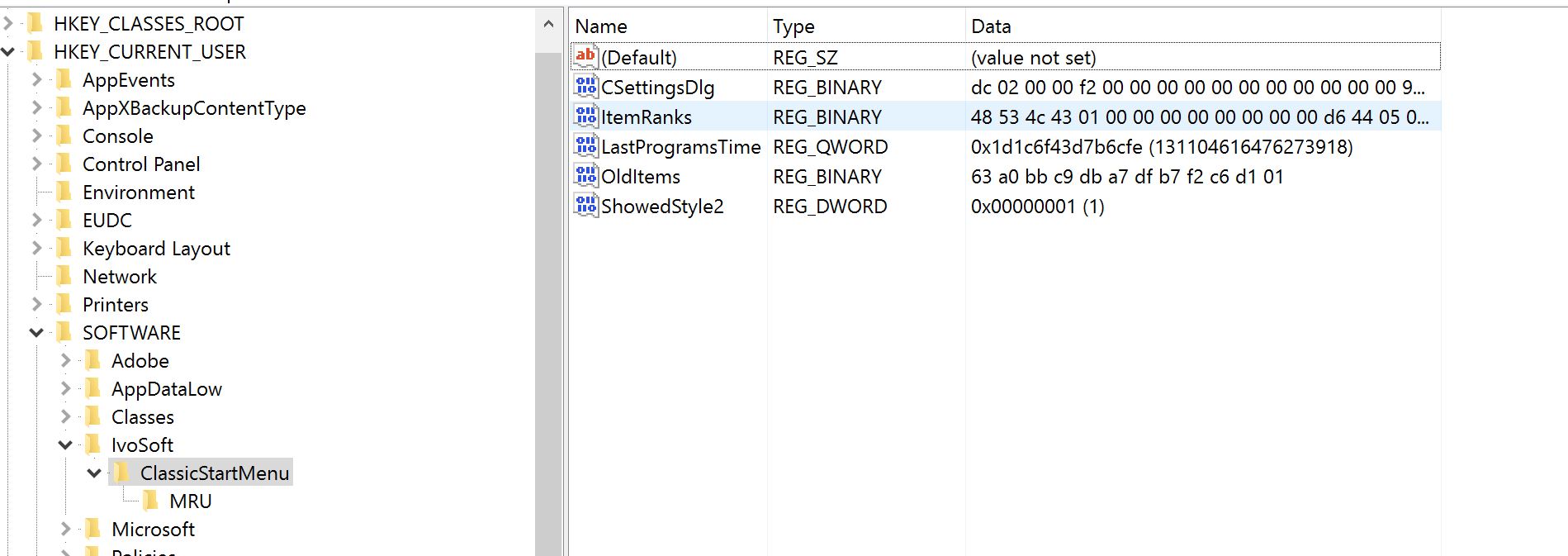 "1. First configure the items in the Classic Start Menu settings GUI dialog. Add or remove items from Customize Start Menu tab. 2. Open Windows Registry Editor (Regedit.exe) and look up the value named MenuItems7 in HKCU\Software\IvoSoft\ClassicStartMenu\Settings. 3. Double click the MenuItems7 value and copy the value data of the 'MenuItems7' value.i was following the posting from earlier to hide items in the start menu below