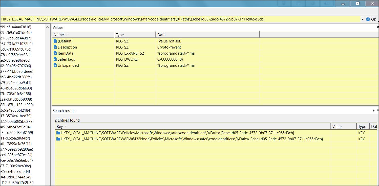 MSI (c) (F4:E8) [06:55:09:057]: Resetting cached policy values MSI (c) (F4:E8) [06:55:09:057]: Machine policy value 'Debug' is 7 MSI (c) (F4:E8) [06:55:09:057]: ******* RunEngine: ******* Product: C:\ProgramData\ClassicShellSetup64_4_3_1.msi ******* Action: ******* CommandLine: MSI (c) (F4:E8) [06:55:09:104]: Machine policy value 'DisableUserInstalls' is 0 MSI (c) (F4:E8) [06:55:09:229]: SOFTWARE RESTRICTION POLICY: Verifying package --> 'C:\ProgramData\ClassicShellSetup64_4_3_1.msi' against software restriction policy MSI (c) (F4:E8) [06:55:09:229]: SOFTWARE RESTRICTION POLICY: C:\ProgramData\ClassicShellSetup64_4_3_1.msi has a digital signature MSI (c) (F4:E8) [06:55:09:932]: SOFTWARE RESTRICTION POLICY: C:\ProgramData\ClassicShellSetup64_4_3_1.msi is not permitted to run at the 'unrestricted' authorization level. MSI (c) (F4:E8) [06:55:09:932]: SOFTWARE RESTRICTION POLICY: The path rule '{3CBE1D05-2ADC-4572-9B07-3711C065D3CB}' with image name 'C:\ProgramData\*.msi' in the default software restriction machine policy disallows execution. The returned execution level was 0 MSI (c) (F4:E8) [06:55:09:932]: The installation of C:\ProgramData\ClassicShellSetup64_4_3_1.msi is not permitted by software restriction policy. The Windows Installer only allows installation of unrestricted items. The authorization level returned by software restriction policy was 0x0 (status return 0x0).