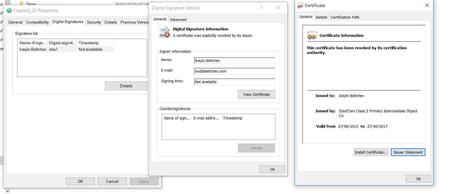 • Check the file properties in Explorer – right-click -> Properties. Look for a tab named “Digital Signatures”. It should list “Ivaylo Beltchev” as the signer. The hacked file doesn’t even display the “Digital Signatures” tab.